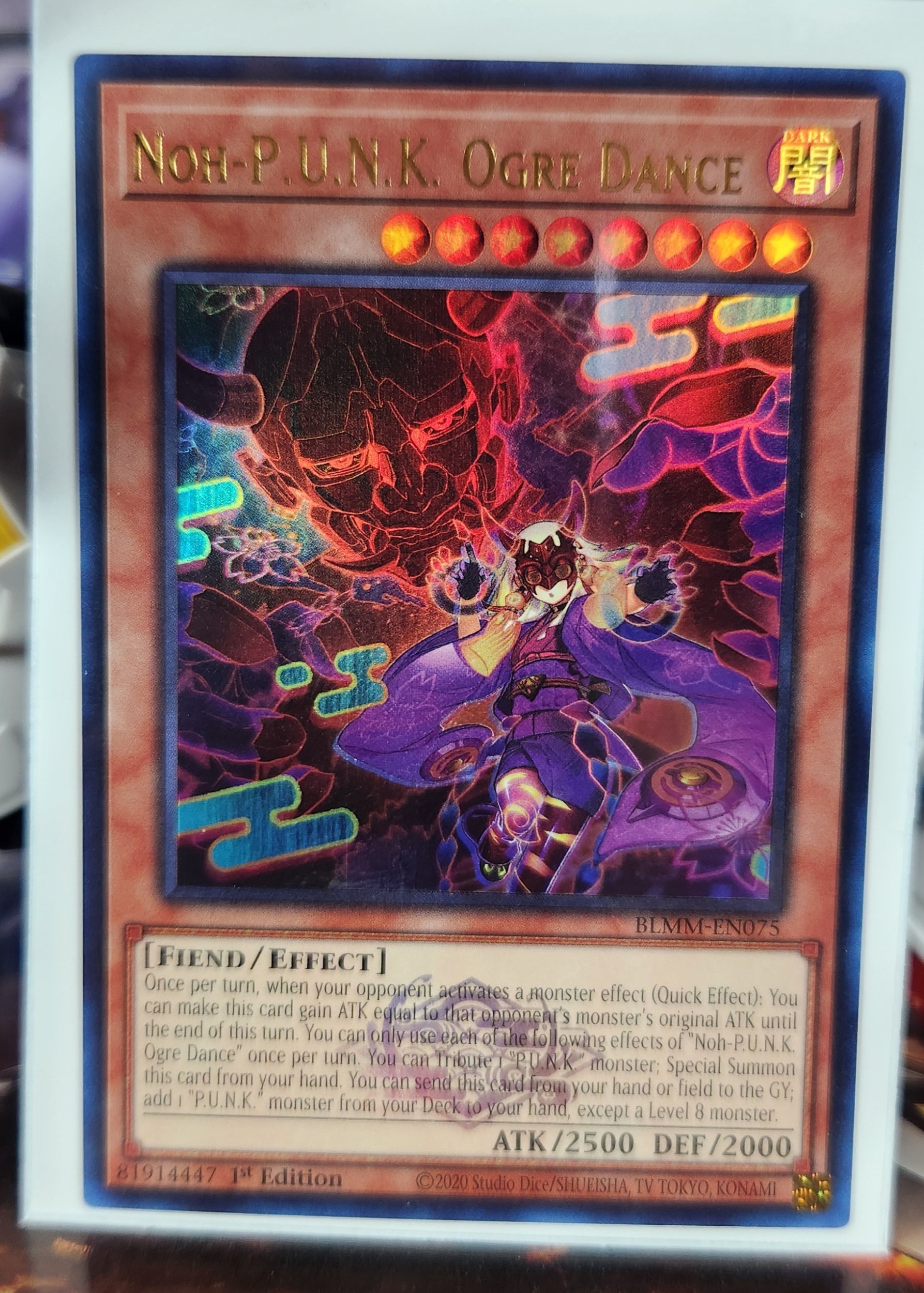 Once per turn, when your opponent activates a monster effect (Quick Effect): You can make this card gain ATK equal to that opponent's monster's original ATK until the end of this turn. You can only use each of the following effects of "Noh-P.U.N.K. Ogre Dance" once per turn. You can Tribute 1 "P.U.N.K." monster; Special Summon this card from your hand. You can send this card from your hand or field to the GY; add 1 "P.U.N.K." monster from your Deck to your hand, except a Level 8 monster.